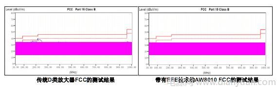 下面是傳統(tǒng)D類放大器和帶有EEE技術(shù)的AW8010的EMI測試結(jié)果,測試使用60cm(24inch)的輸出線。上面的紅色實(shí)線是FCC CLASS B的標(biāo)準(zhǔn)線,紅色虛線是-6dB的裕量線,藍(lán)色的線是實(shí)際測試曲線,粉色的線是測試環(huán)境的EMI背景噪音。