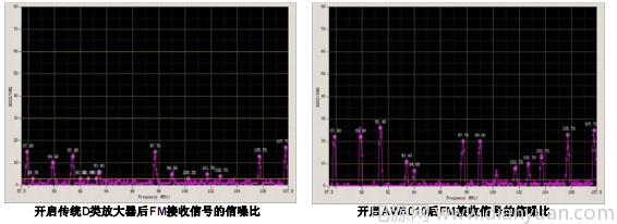 下圖是傳統(tǒng)D類放大器和帶EEE技術(shù)的AW8010對FM接收信號的信噪比影響。傳統(tǒng)D類放大器對FM的影響很嚴(yán)重,信號變差甚至丟臺,而帶EEE技術(shù)的AW8010對FM影響很小,降低了系統(tǒng)工程師的調(diào)試難度。