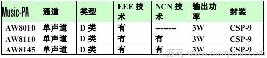高效率、低功耗使得D類放大器的應(yīng)用越來越廣泛,D類放大器EMI也越來越受到關(guān)注。采用艾為帶有EEE技術(shù)的AW8010、AW8110、AW8145,極大地降低了EMI的輻射,簡化了設(shè)計(jì)。其中音樂功放AW8110、AW8145同時還采用了獨(dú)特的、擁有專利保護(hù)的無破音(NCN:Non-Crack-Noise)技術(shù),提高音質(zhì)的同時有效地保護(hù)揚(yáng)聲器,是音樂手機(jī)等便攜式設(shè)備的理想選擇。