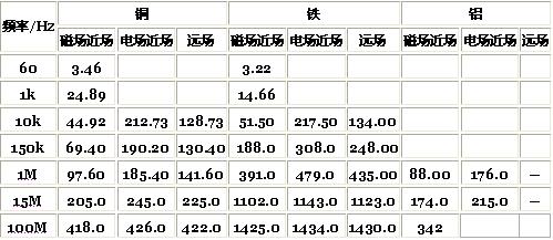 場(chǎng)源距離不同材料的屏蔽體(厚度0.254mm)30cm遠(yuǎn)的屏蔽效能(dB)計(jì)算結(jié)果見表1。表1中近場(chǎng)和遠(yuǎn)場(chǎng)的分界點(diǎn)為λ/2π,λ為電磁場(chǎng)的波長(zhǎng)。