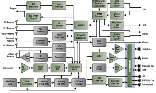 圖7:智能手機框圖及需要保護的I/O接口(見右下側淺藍色背景區(qū)域)
