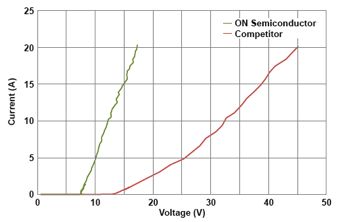 安森美半導體的ESD鉗位性能備受業(yè)界推崇,鉗位性能可從幾種方法觀察和量化。使用幾個標準工具即可測量獨立ESD保護器件或集成器件的ESD鉗位能力,包括ESD保護功能。第一個工具是ESD IEC61000-4-2 ESD脈沖響應截圖,顯示的是隨時間推移的鉗位電壓響應,可以看出ESD事件中下游器件的情形。