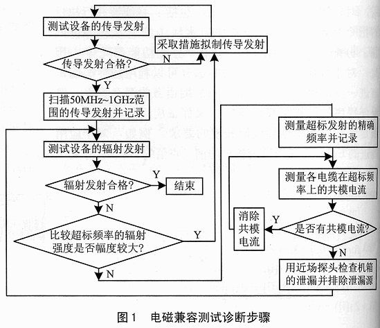 圖1給出了一個(gè)設(shè)備或系統(tǒng)的電磁干擾發(fā)射與故障分析步驟。按照這個(gè)步驟進(jìn)行,可以提高測試診斷的效率。