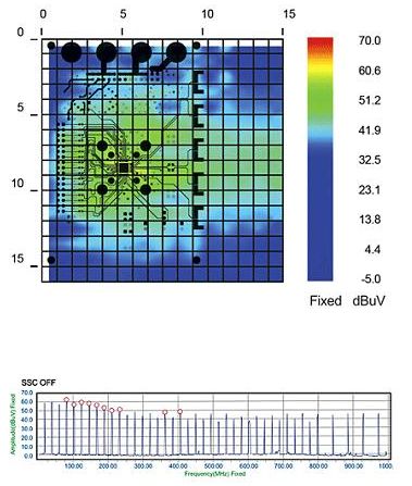 極近場掃描系統(tǒng)完成了空間和頻譜掃描后顯示并生成了以下輻射特性圖。需注意的是,掃描結(jié)果疊加在Gerber設(shè)計(jì)文件上,因此這樣對結(jié)果進(jìn)行分析可以立即確定待測器件中的具體輻射體。圖2顯示了SSCG功能為“關(guān)”時(shí)待測器件的輻射特性。