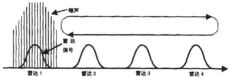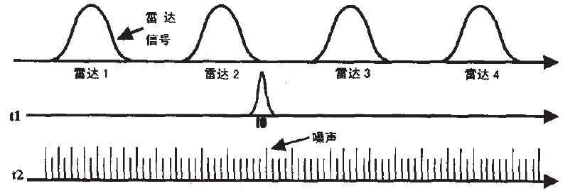掃頻干擾方式主要在雷達的整個調(diào)諧頻帶內(nèi)重復進行點干擾,雖然此方式不能比寬帶噪聲干擾給出更多的平均功率,但是掃頻干擾使每個雷達周期性地承擔最大可能的功率。事實證明,通過調(diào)整掃描頻率以保持雷達通帶內(nèi)的干擾時間約等于雷達發(fā)射脈沖寬度,掃頻干擾方式在產(chǎn)生假目標方面是最有效的。并且對于掃描雷達,掃頻干擾可產(chǎn)生足夠可信賴的假目標。其工作方式如圖3所示。