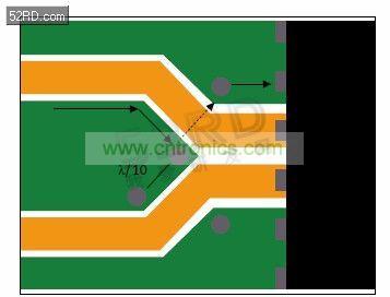 時(shí)鐘分布或合成器設(shè)備路由出來、用于承載相同頻率的跡線集群可能相鄰而行,因?yàn)楦蓴_源音調(diào)已經(jīng)存在于接收器線路上。不過,分組的線路最終會分散。分散時(shí),應(yīng)在分散線路之間提供接地灌流,并在其開始分散的地方灌入通孔,以便感應(yīng)回流沿著額定回流路徑流回。在圖3中,接地島末端的通孔可使感應(yīng)電流流到參考層上。接地灌流上其它通孔之間的間隔不要超過一個(gè)波長的十分之一,以確保接地不會成為共振結(jié)構(gòu)。