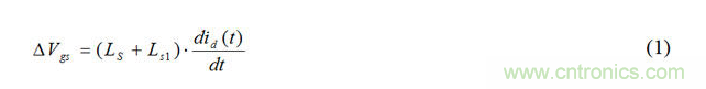 在諧振條件(ωL = 1/ωC)下,柵極和源極 電壓中生成的震蕩電壓遠大于驅動電壓。因諧振變化而產生的電壓振蕩與品質因數(shù)成正比, Q(=ωL/R = 1/ωCR)。當MOSFET關閉時,漏極寄生電感(LD + Ld1)、柵極-漏極電容Cgd和柵極引線電感Lg1網絡造成柵極 振蕩電壓。如果柵極電阻 (RG-ext.+Rg_int.)極小,則Q變大。另外,LS兩端的壓降和Ls1源極雜散電感在柵極-源極電壓中產生振蕩,可用表達式(1)表示。寄生振蕩可能造成柵源極擊穿、不良EMI、較大開關損耗、柵極控制失效,甚至可能造成MOSFET故障。