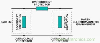 圖5顯示一個典型保護方案,其特征是具有兩重保護:主保護和次級保護。主保護可將大部分瞬變能量從系統(tǒng)轉(zhuǎn)移開,通常位于系統(tǒng)和環(huán)境之間的接口。它旨在將瞬變分流至地,從而消除大部分能量。