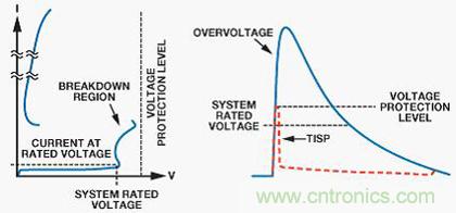 TISP的非線性電壓-電流特性通過轉(zhuǎn)移產(chǎn)生的電流來限制過壓。作為晶閘管,TISP具有非連續(xù)電壓-電流特性,它是由于高電壓區(qū)和低電壓區(qū)之間的切換動作而導(dǎo)致的。圖8顯示了器件的電壓-電流特性。在TISP器件切換到低電壓狀態(tài)之前,它具有低阻抗接地路徑以分流瞬變能量,雪崩擊穿區(qū)域則導(dǎo)致了箝位動作。在限制過壓的過程中,受保護電路短暫暴露在高壓下,因而在切換到低壓保護導(dǎo)通狀態(tài)之前,TISP器件處在擊穿區(qū)域。TBU將保護下游電路,防止由于這種高電壓導(dǎo)致的高電流造成損壞。當轉(zhuǎn)移電流降低到臨界值以下時,TISP器件自動復(fù)位,以便恢復(fù)正常系統(tǒng)運行。