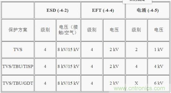 上一解決方案可提供最高四級ESD和EFT保護,但只能提供二級電涌保護。為了提高電涌保護級別,保護電路變得更加復(fù)雜。以下保護方案可以提供最高四級電涌保護。