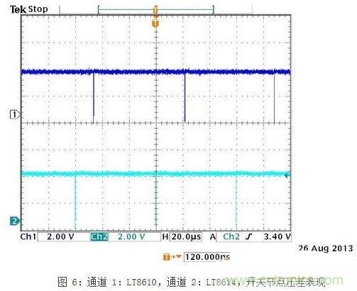 圖 5顯示了13.2V輸入的開關節(jié)點。可以看到,LT8614與理想方波的偏離極小,如通道2所示。圖3、4和5中的所有時間域測量結果都是用 500MHzTektronixP6139A探頭測得的,封閉的探頭尖端屏蔽罩連接至PCBGND平面,測試均在標準演示電路板上進行。[page]