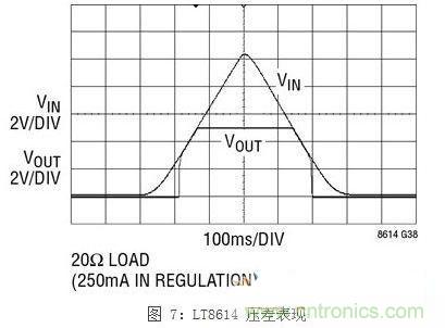 除了面向汽車環(huán)境的42V絕對最大輸入電壓額定值,器件的壓差表現(xiàn)也非常重要。常常需要支持至關重要的3.3V邏輯電源以應對冷車發(fā)動情況。在這種情況 下,LT8614SilentSwitcher穩(wěn)壓器保持接近LT861x系列的理想表現(xiàn)。LT8610/11/14器件不是像其他器件那樣提供更高的欠 壓閉鎖電壓和最大占空比箝位,而是以低至3.4V的電壓工作,而且只要有必要,就跳過若干周期,如圖6所示。這樣就產生了理想的壓差表現(xiàn),如圖7所示。