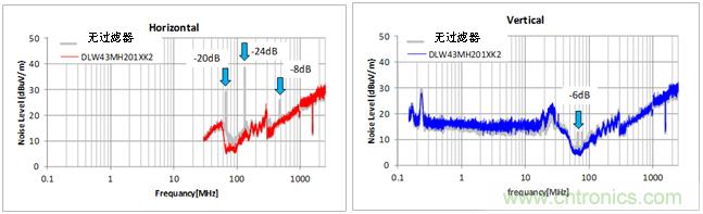 圖6:車(chē)載Ethernet中DLW43MH系列的噪聲抑制效果