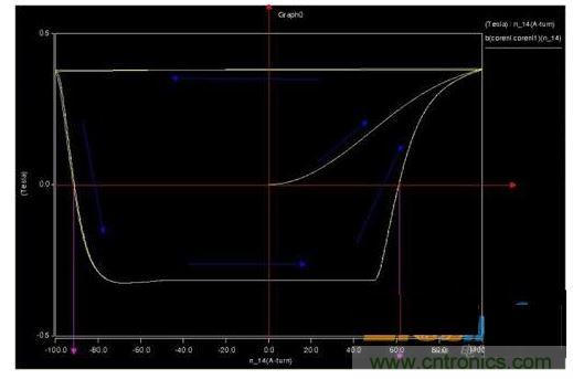 2、仿真CCM模式,磁滯回線(xiàn)上會(huì)出現(xiàn)兩個(gè)安匝跳變位置,但是磁通密度并不能跳變,而是通過(guò)下降來(lái)釋放能量。