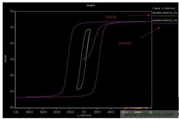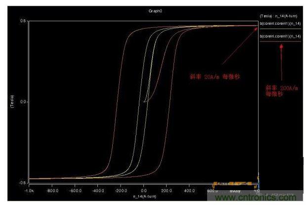 用三角波仿真了下磁芯,磁滯回線(xiàn)方正了很多,也不會(huì)因?yàn)檎乙?guī)律產(chǎn)生嚴(yán)重的拖尾效應(yīng)。圖2是同頻率不同幅度。圖3同斜率不同幅度的。