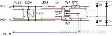 對(duì)ACL與ACN之間施加的浪涌電壓稱為差模浪涌電壓,差模路徑如圖中紅線所示;對(duì)ACL(或ACN)與PE之間施加的電壓稱為共模浪涌電壓,共模路徑如圖中藍(lán)線所示。