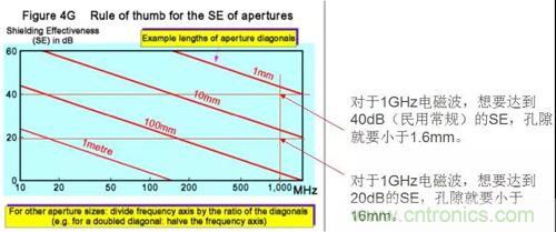 在一個完美的屏蔽殼體上開一個洞,相當于構(gòu)成一個半波共振縫隙天線,屏蔽效能SE與孔的最大尺寸d、電磁波波長λ關(guān)系如下: