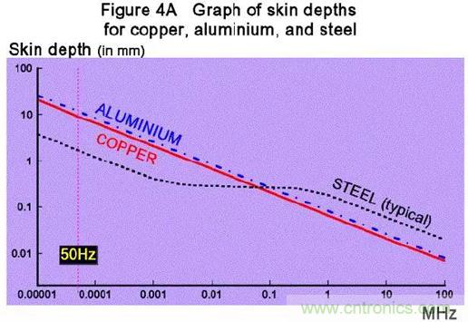 上圖:不同頻率下三種金屬的趨膚效應深度(頻率越高,深度越淺,越趨膚);趨膚效應以傳導的角度看,是希望趨膚深度深的,那表示導線的利用率高;但是對于屏蔽,是希望趨膚深度淺的,這樣就能以較薄的金屬屏蔽更多的電磁頻段;50Hz的趨膚深度5~15mm,很難屏蔽……