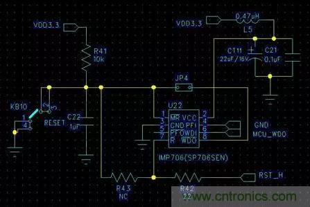 本人有一次對整機EMC整改,ESD試驗時,按鍵控制板的MCU老是復(fù)位。后來用示波器進行追蹤,發(fā)現(xiàn)是外部看門狗芯片發(fā)生復(fù)位,導(dǎo)致MCU復(fù)位。于是先在電源上并接TVS管,還是會復(fù)位;再在看門狗芯片VCC管腳旁并接22uF鉭電容,情況好一些,但還是會復(fù)位;最后再串接一個0.47uH的貼片電容,組成LC濾波(如圖3.1所示)。在+-6KV的ESD接觸放電下,就再也不會復(fù)位,而且工作正常。