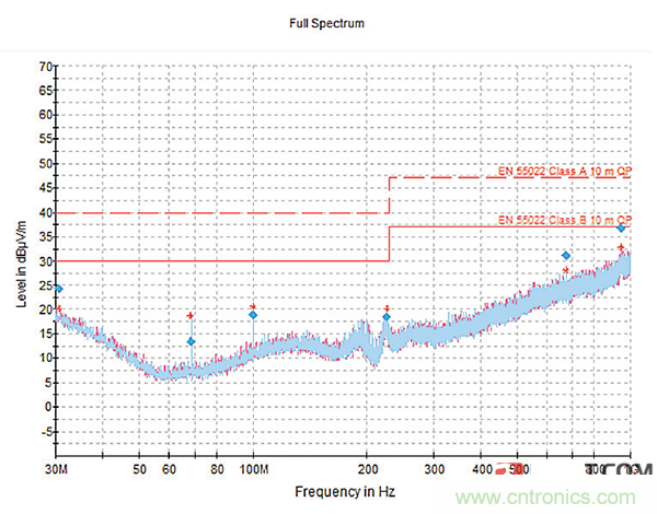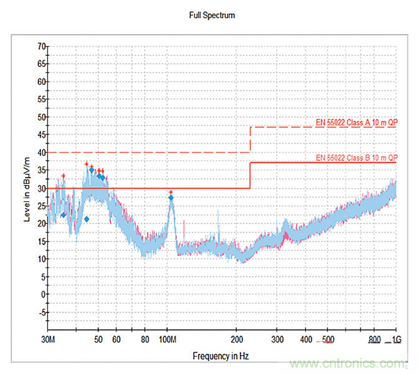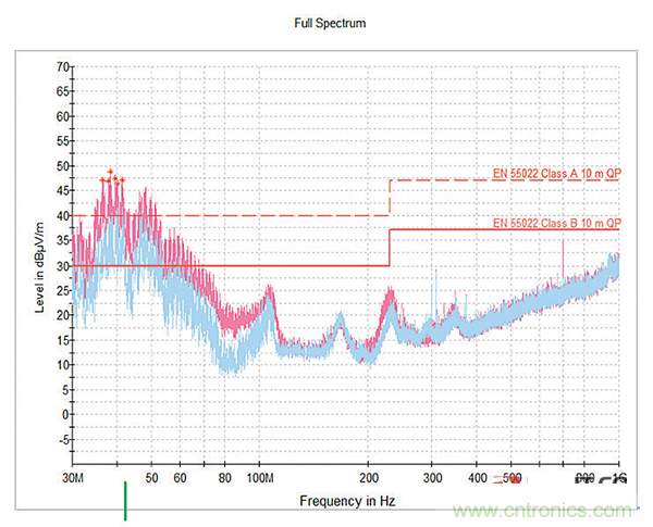 這種濾波器插入設計提供了最大的屏蔽效能,并使等效串聯電感最小化,為芯片電容器提供可用的最佳性能,同時還利用了系統中已存在的屏蔽。結合專用的22000pF濾波器,濾波器插入實現了圖10所示的結果,從而以具有成本效益的長期解決方案來滿足EMC法規(guī)。
