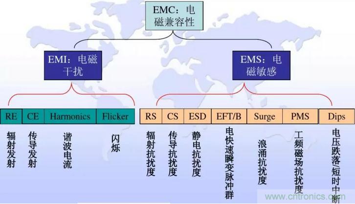 電磁兼容性(EMC)是指設備或系統(tǒng)在電磁環(huán)境中符合要求運行并不對其環(huán)境中的任何設備產(chǎn)生無法忍受的電磁干擾能力,電磁兼容(EMC)包含電磁干擾(EMI)和電磁抗擾度(EMS)。其包含的測試項目如圖1所示。