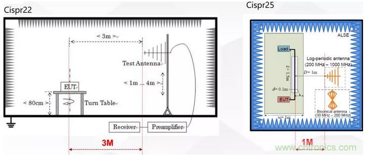 如圖3所示電磁干擾的輻射測試普遍采用天線接收法測試,相比于CISPR22來說CISPR25額外增加了150KHz ~ 30MHz的輻射測試,這部分測試頻段覆蓋了DCDC的工作頻率范圍,是輻射測試的難點。另外CISPR-25輻射測試采用1M法天線距離更近,測試接收的信號更強。