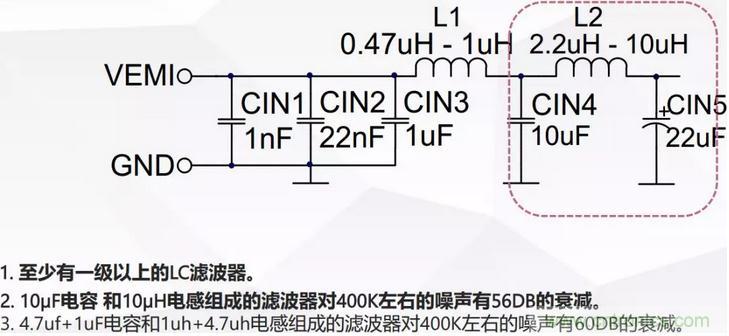所有的LC濾波器都是以電感結束,并且要遠離DCDC的高頻環(huán)路。防止電流環(huán)路的近場磁場效應對輸入濾波器的影響。