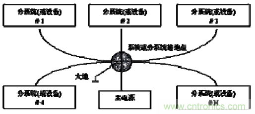 單點接地連接是指在產(chǎn)品的設(shè)計中,接地線路與單獨一個參考點相連,該點常常以地球為參考,如圖所示。