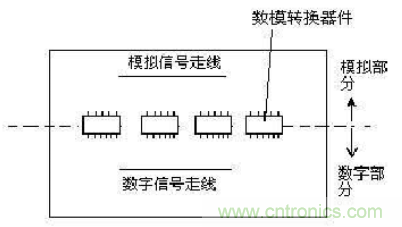 另外,也有一種統(tǒng)一地的處理方法,也就是不進(jìn)行地分割,但規(guī)定各自的范圍,保證數(shù)字和模擬走線及回流不會經(jīng)過對方的區(qū)域。這種策略一般實用于數(shù)模器件比例相當(dāng),并存在多個數(shù)模轉(zhuǎn)換器件的情況,有利于降低地平面的阻抗,參考地線設(shè)計如圖8-13所示: