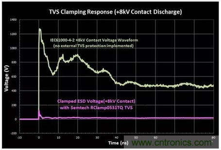 TVS Clamping Response ( 8kV Contact Discharge): TVS鉗位響應(yīng)( 8kV接觸放電)8kV Contact voltage waveform: 8kV接觸電壓波形No external TVS protection implemented: 沒(méi)有使用外部TVS保護(hù)Clamped ESD voltage( 8kV contact) with Semtech RClamp0531TQ TVS: 使用Semtech RClamp0531TQ TVS的鉗位ESD電壓( 8kV接觸電壓)Time: 時(shí)間