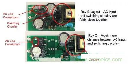 圖2:從電路板布局進(jìn)行 EMI 掃描,其中 AC 輸入與開關(guān)電路距離較近