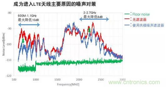 通過(guò)這些對(duì)策,如圖8所示,天線(xiàn)中進(jìn)入的噪聲最大可降低20dB,LTE的接收靈敏度取決于頻帶,改善了8dB。