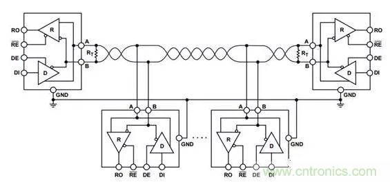 為了消除在通信電纜中的信號(hào)反射,一般使用雙絞線來避免干擾。對(duì)于比較長的連接,一般的做法是在RS-485總線的開始和末端都并接終端電阻,因?yàn)榇蠖鄶?shù)雙絞線電纜特性阻抗大約在120Ω左右。