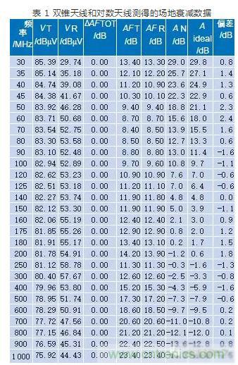 表1:雙錐天線和對數天線測得的場地衰減數據