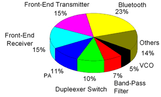 LTCC器件按其所包含的元件數(shù)量和在電路中的作用,大體可分為LTCC元件、LTCC功能器件、LTCC封裝基板和LTCC模塊基板。LTCC屬于高新科技的前沿產(chǎn)品,廣泛應(yīng)用于微電子工業(yè)的各個領(lǐng)域,具有十分廣闊的應(yīng)用市場和發(fā)展前景。目前LTCC 技術(shù)已經(jīng)進入更新的應(yīng)用階段,包括無線區(qū)域網(wǎng)絡(luò)、地面數(shù)位廣播、全球定位系統(tǒng)接收器組件、數(shù)位信號處理器和記憶體等及其他電源供應(yīng)組件甚至是數(shù)位電路組件基板。例如,村田、三菱電工、京瓷、TDK、Epcos、日立、Avx等十多家開發(fā)的手機無線開關(guān)組件,NEC、村田和和易利信等開發(fā)的藍牙組件都是由LTCC技術(shù)制成的。此外,LTCC組件因其結(jié)構(gòu)緊湊,高耐熱和耐沖擊性,目前在軍工和航天設(shè)備中廣泛應(yīng)用,預(yù)計未來在汽車電子系統(tǒng)上的應(yīng)用也會非常普遍。CTS 公司已經(jīng)宣布將為汽車電子市場提供低溫燒結(jié)陶瓷(LTCC)電路板。圖6為目前LTCC器件應(yīng)用領(lǐng)域所占比例。
