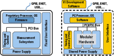 圖1、傳統(tǒng)儀器(左圖)和基于軟件的虛擬儀器(右圖)具有許多相同的結(jié)構(gòu)組件,但是在體系結(jié)構(gòu)原理上完全不同
