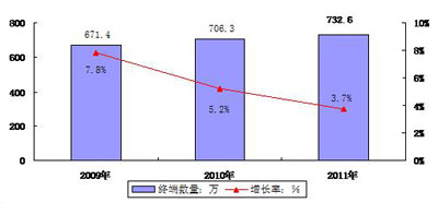 圖2 2009-2011年中國(guó)便攜式電子學(xué)習(xí)產(chǎn)品市場(chǎng)銷售量及其發(fā)展速度預(yù)測(cè)