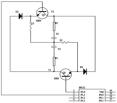 本實驗中,選用兩個小功率NPN管C1815(Q1、Q2)來替代開關(guān)管,用89C51芯片的P1.0和P1.1腳控制Q1、Q2的開關(guān)。同時,蓄電池的端電壓V1和V2由差動放大電路采集,經(jīng)A/D轉(zhuǎn)換送到CPU。在整個過程中,電壓每20ms采樣一次,每隔1s上傳上位機并保存并自動繪制曲線。圖5為試驗電路圖。