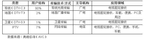 根據(jù)不同傳輸方式,中國(guó)DTV主要分為有線數(shù)字電視、地面數(shù)字電視、衛(wèi)星數(shù)字電視以及IPTV四種類型。(傳統(tǒng)意義上數(shù)字電視分有線、地面及衛(wèi)星三種類型。但AVC認(rèn)為,從應(yīng)用角度來講,IPTV是數(shù)字電視的一種特殊表現(xiàn)形式,故將IPTV也列入比較之列)
