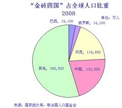 圖1:2008年金磚四國占全球人口比重。數(shù)據(jù)來源:中國國家統(tǒng)計(jì)局,聯(lián)合國人口基金會
