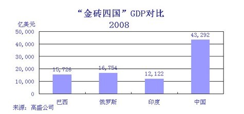圖3:2008年金磚四國GDP對比。數(shù)據(jù)來源:高盛