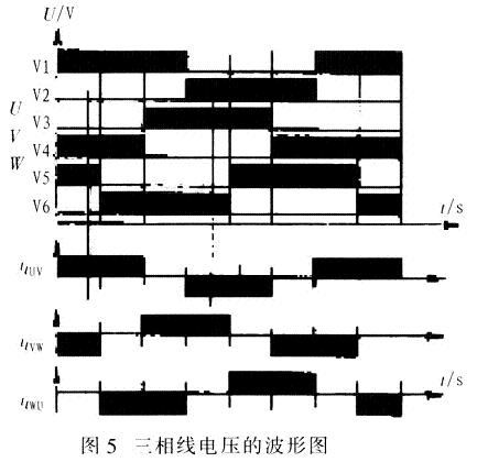 (5)由V1~V6組成的橋式三相逆變主電路是逆變器的核心電路。圖4為三相逆變器的主電路圖,輸入端為A、B,輸出為U、V、W。圖5中V1~V6的導(dǎo)通順序,陰影部分為各個(gè)IGBT的導(dǎo)通時(shí)間。每一格的時(shí)間為π/3,三相線電壓的波形如圖5所示。