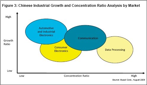 汽車與工業(yè)電子市場具有多樣化與分散化特點。但在中國,未來五年內(nèi),這兩個領(lǐng)域?qū)⑹撬袘?yīng)用領(lǐng)域中增長最快的。工業(yè)高速增長和制造業(yè)集約化程度低,為分銷商提供了許多商業(yè)機會。圖3所示為iSuppli公司對中國工業(yè)增長與集中程度的分析,按市場細(xì)分。