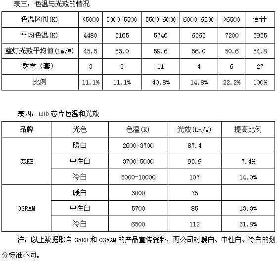 眾所周知,LED路燈的光效與色溫密切相關(guān)。從表四可看出,GREE芯片不同色溫的光效差別不大,但OSRAM芯片則不然,不同色溫的光效差別較大,6500K芯片比5700K芯片光效提高31.8%。因此,LED路燈必須在色溫與光效之間取得平衡,既要充分考慮市民的舒適感和滿意度,也不能為追求低色溫而大幅犧牲光效。畢竟,照度和功率密度值是《城市道路照明設(shè)計(jì)標(biāo)準(zhǔn)》(CJJ45-2006)的硬指標(biāo),必須有較高光效才能滿足要求。同時(shí),由于不同色溫芯片的價(jià)格差別較大,成本因素也需要認(rèn)真考慮。