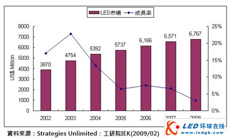 - 2008年全球LED市場較2007年微幅成長3%,達67.6億美元