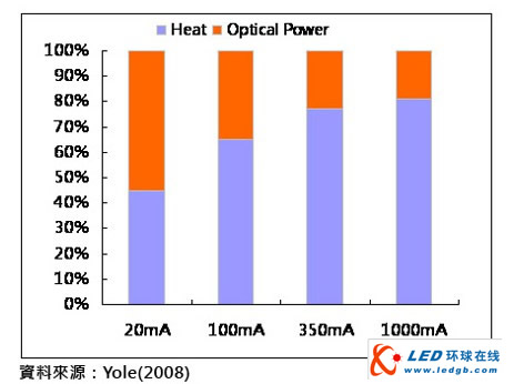 LED發(fā)光效率除了影響到光通量輸出,以及耗能外,「熱」另外一個重要關(guān)鍵,以目前普遍商品化LED發(fā)光效率分析(如圖五),1W高功率LED發(fā)光效率約在70lm/W左右,其中有77%能量以熱的型態(tài)表現(xiàn)出來,僅有23%能量以光的型態(tài)表現(xiàn)出來,當輸入功率愈高,產(chǎn)生的熱愈多,因此需要更多的散熱組件,導致LED成本提高、可靠度降低,若能提高LED發(fā)光效率,LED散熱問題自然可以解決。
