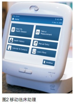 其次是醫(yī)療信息化產(chǎn)品,比如上海交大生物醫(yī)學(xué)工程研究所開發(fā)的生命體征監(jiān)測無線服務(wù)平臺。平臺的核心就是一個(gè)多參數(shù)體征測量儀(iCare)、GSM模塊和網(wǎng)絡(luò)、智能分析軟件和服務(wù)器,可以部署在社區(qū)和醫(yī)院,這樣類似的系統(tǒng)國內(nèi)已經(jīng)成功地應(yīng)用在工業(yè)控制中了,只要把多參數(shù)體征測量儀設(shè)計(jì)完善好,系統(tǒng)構(gòu)建和實(shí)施難度不大。再如,Intel公司的移動臨床助理(Mobile Clinical Assistant)(如圖2),核心是Intel 高性能、低功耗移動便攜系統(tǒng)方案,可以很方便地布置在醫(yī)院病房、病人家里和醫(yī)生的診所,經(jīng)過專業(yè)醫(yī)療儀器廠家的定制和生產(chǎn),裝置已經(jīng)完全符合醫(yī)療上的密封、消毒和安全的要求。國內(nèi)嵌入式系統(tǒng)企業(yè)應(yīng)該完全有能力設(shè)計(jì)出類似的裝置,而且如果采用國產(chǎn)ARM SoC 方案,體積還能更小,價(jià)格更便宜,功耗還能低。