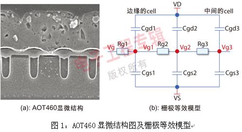 通常從外部來看,MOSFET是一個獨立的器件,事實上,在其內部,由許多個單元(小的MOSFET)并聯(lián)組成,圖1(a)為AOT460內部顯微結構圖,其內部的柵極等效模型如圖1(b)所示。MOSFET的結構確定了其柵極電路為RC網絡。
