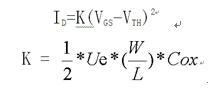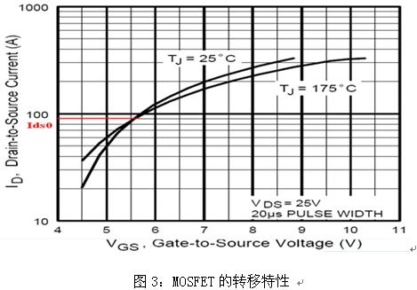 圖3為MOSFET處于飽和區(qū)時漏極電流ID與柵極電壓VGS的關系曲線即轉移特性,用公式可表示為: