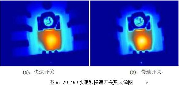 圖6為AOT460在同一應用中快速開關和慢速開關情況下的熱成像照片??梢钥闯觯诼匍_關情況下MOSFET的局部溫度要高于快速開關情況下的溫度,過慢的開關速度會導致MOSFET因局部溫度過高而提前失效。
